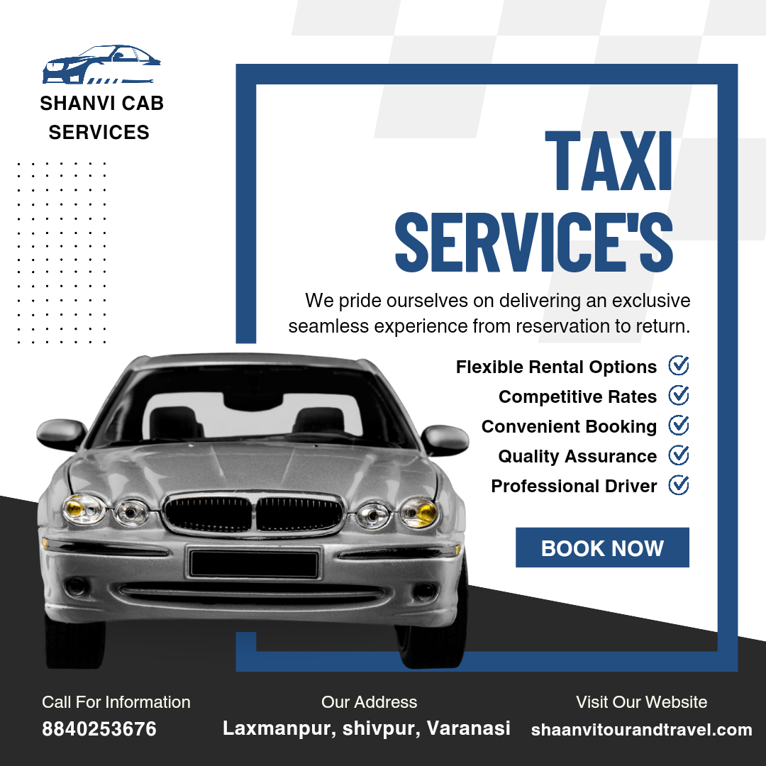 Explore Varanasi with Shaanvi Cab Services! Looking for reliable and affordable taxi services in Varanasi? Look no further than Shaanvi Cab Services, your one-stop solution for seamless travel experiences in the holy city. Whether you're a tourist, a business traveler, or a local resident, we cater to all your transportation needs with a wide range of services: City Taxis: Navigate the bustling streets of Varanasi with ease. Hire our comfortable and well-maintained cabs for point-to-point transfers within the city. Airport Pickups & Drops:Arrive and departureVaranasi with peace of mind. Book our reliable airport taxi service for convenient transfers to and from Lal Bahadur Shastri International Airport. Car Rental services in Varanasi